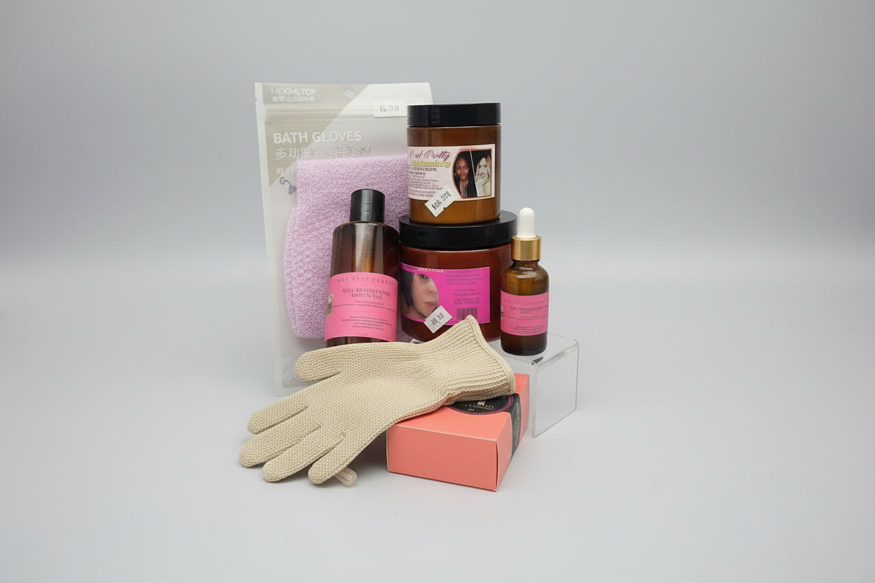 Designed for those seeking comprehensive skincare transformation, this curated collection addresses both facial and body concerns with professional-grade formulations. The bundle pairs a medium body cream with targeted face cream, lightweight serum, and specialized lightening body wash—all complemented by exfoliating scrub gloves and clarifying face soap. Each component works synergistically to deliver visible refinement across your entire complexion and skin texture.